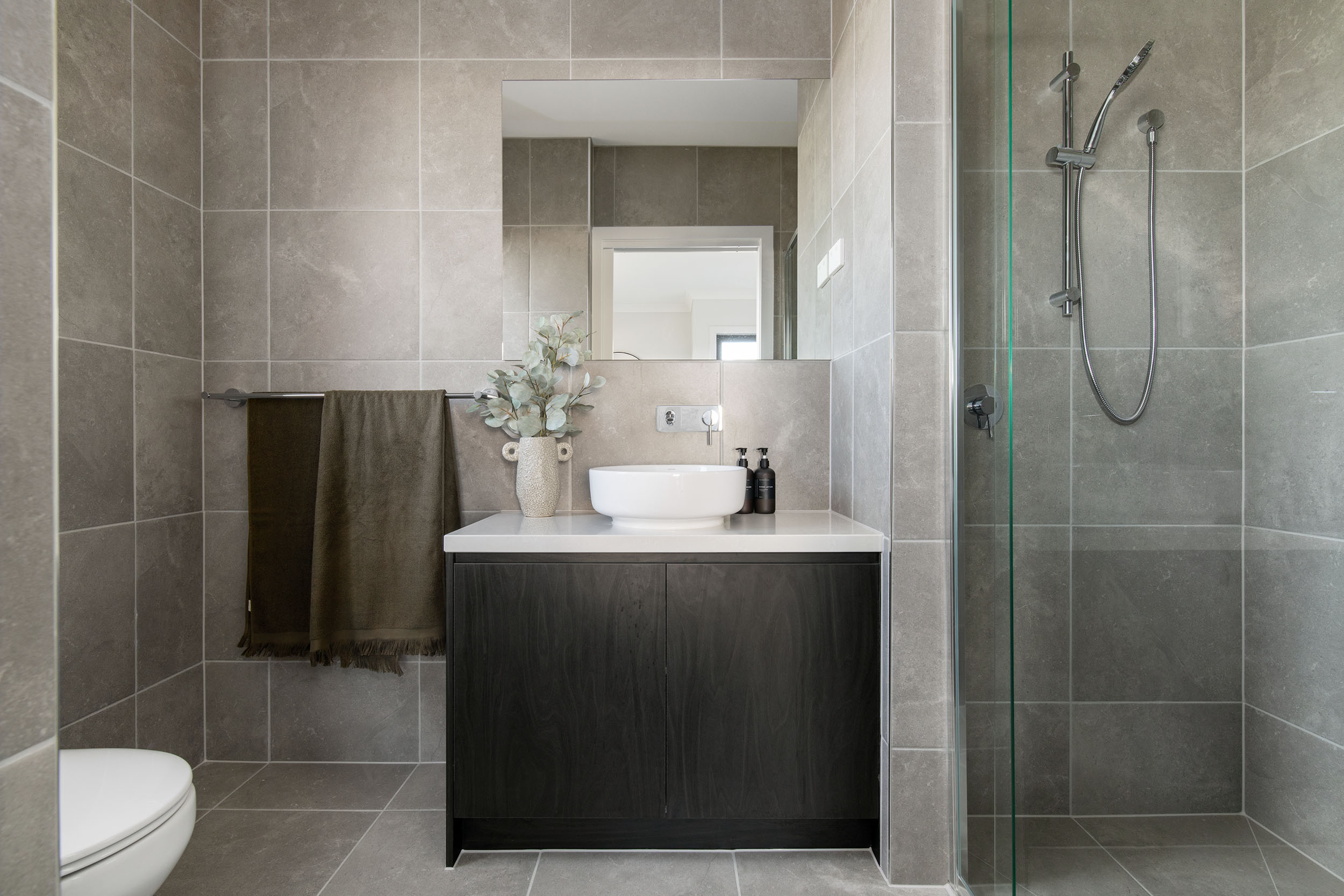 - 40mm Caesarstone benchtops and floor-to-ceiling bathroom tiles